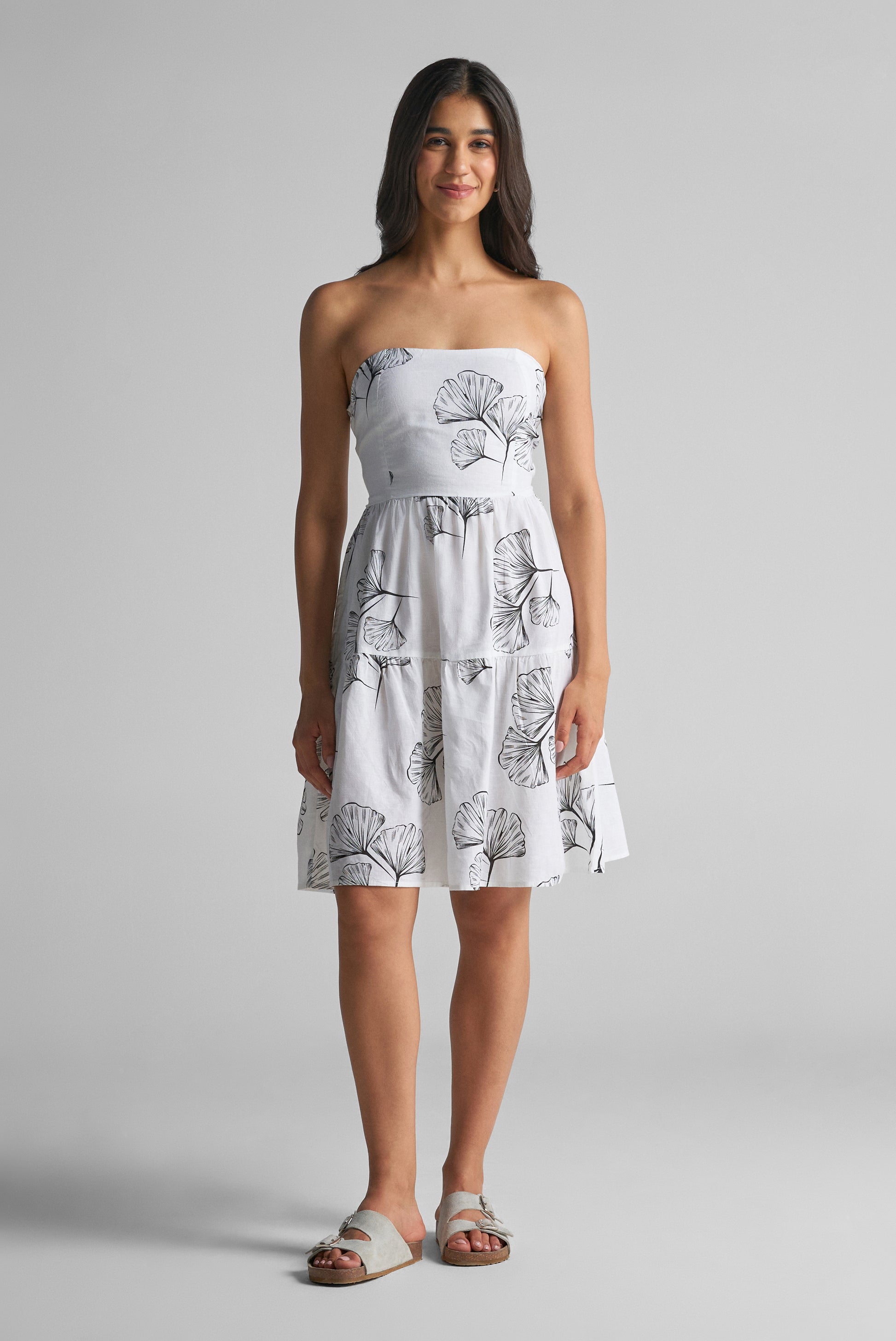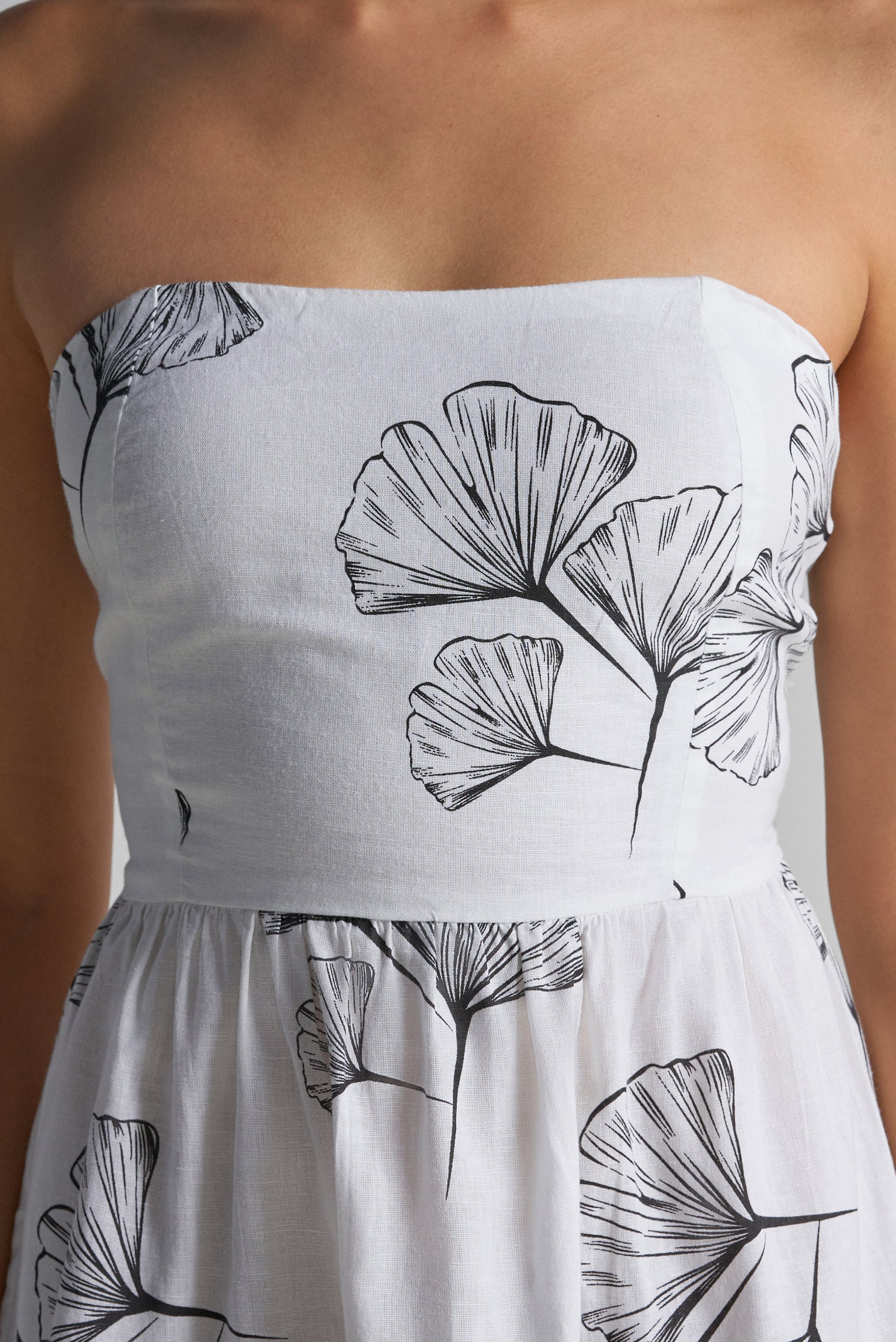 Bold yet classic, this strapless dress stands out with a timeless black and white botanical print. The fitted bodice highlights your shape, while the flared skirt brings just the right mix of playful movement and refined style. Made from breathable fabric, it's a comfortable pick for summer outings, brunch plans, or any special occasion that calls for effortless polish.