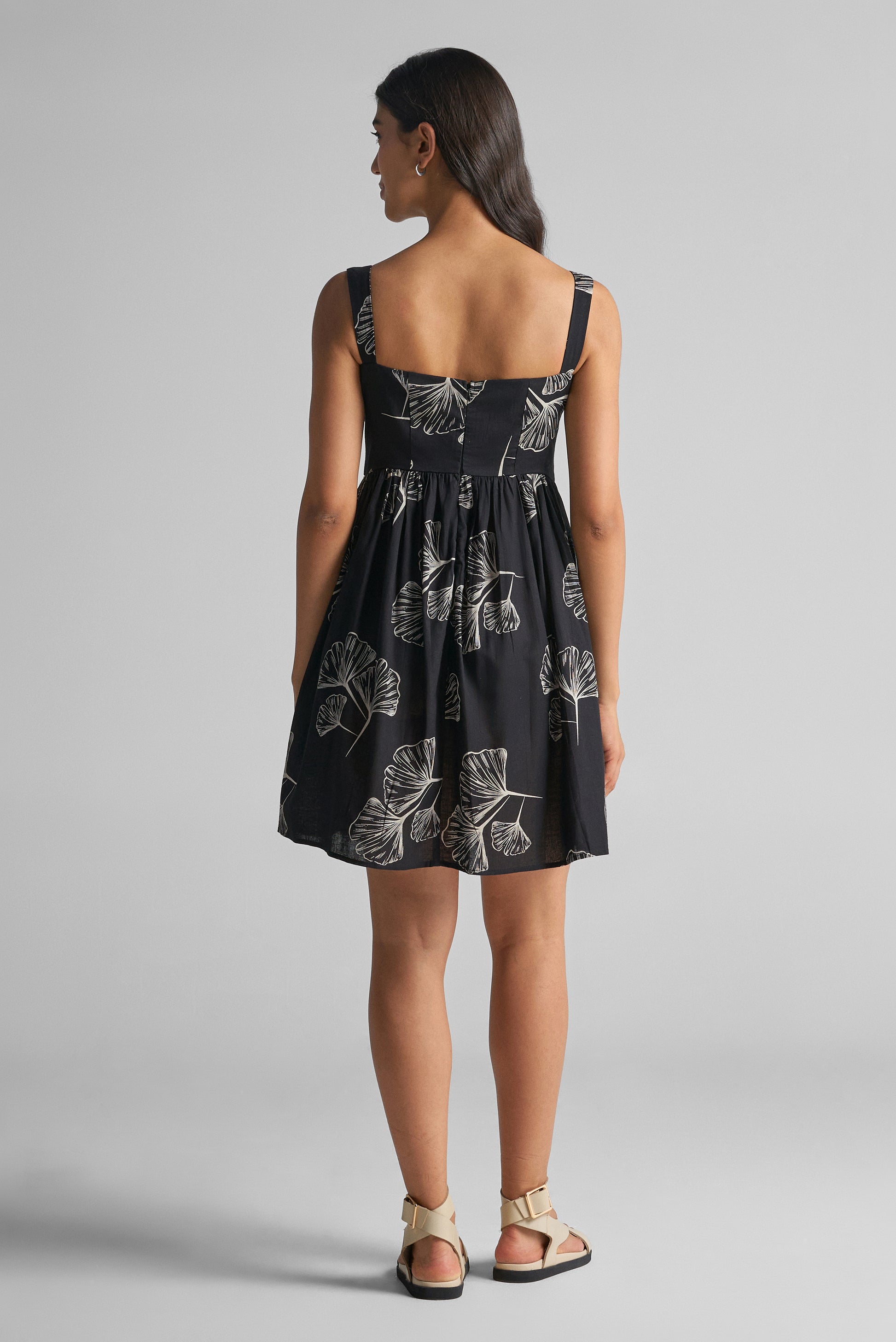 A sophisticated choice for any occasion, this black dress features a striking white botanical print that adds a fresh, modern touch. The square neckline and wide shoulder straps create a clean, flattering silhouette, while the fitted bodice offers both structure and comfort. A pleated, flowy skirt adds soft movement and a hint of playfulness. Ideal for brunch dates, casual outings, or evening strolls, it’s a versatile piece you’ll reach for again and again.